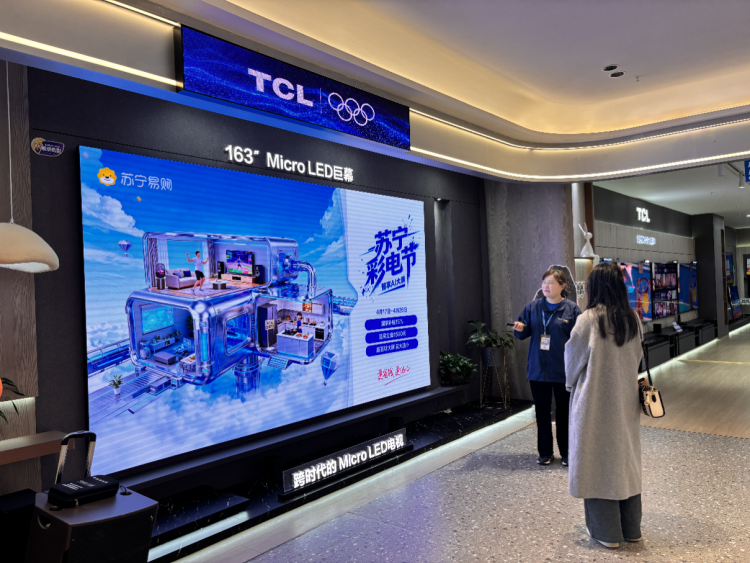 AI技术迭代叠加零供关系升级,推动大屏智能电视走向普惠。依托规模化集采的渠道优势,苏宁易购将渠道端的精准洞察前置至产品研发环节,从源头优化成本结构,让AI大屏的定价更加亲民。以行业标杆级产品163寸巨幕电视为例,彩电节期间新品上市价格仅为上代产品的三分之一,用户到店参与体验及预售活动,还可额外获赠一台98寸电视。同时,苏宁易购持续提升AI彩电在终端的渗透率,目前门店在售彩电中智能类新品占比达90%,AI新品价格门槛低至1499元。海信、TCL、创维等核心品牌方一致表示,将在产品资源、促销政策及服务保障等方面全力加码彩电节,共同加速AI大屏产品的普及进程。