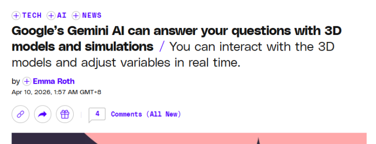 【环球网科技综合报道】4月11日消息,据theverge报道,谷歌Gemini 近期实现升级,将能够根据用户问题生成交互式 3D 模型。