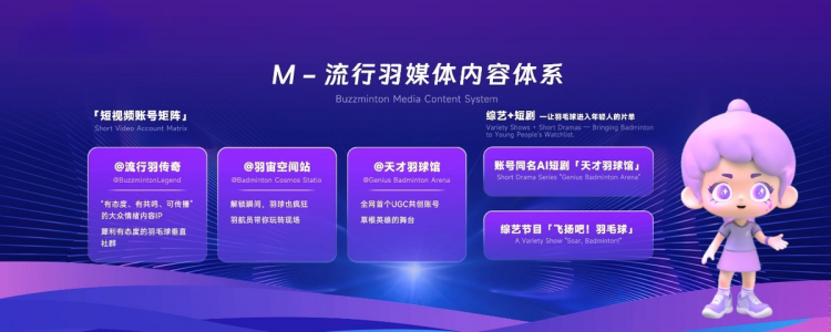 在媒体内容端,流行羽将打造三大账号矩阵,并将推出《天才羽球馆》同名AI短剧及与芒果TV联动的综艺IP《飞扬吧!羽毛球》。