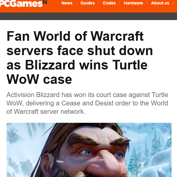 【环球网科技综合报道】4月13日,据外媒 PC Games报道,近日,美国加利福尼亚地区法院就动视暴雪起诉Turtle WoW侵权一案作出判决,暴雪最终胜诉,法院向这款知名《魔兽世界》私人服务器网络下达立即生效的停止令,Turtle WoW的运营生涯或将画上句号。
