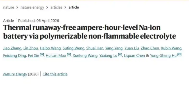 该研究以“Thermal runaway-free ampere-hour-level Na-ion battery via polymerizable non-flammable electrolyte”为题发表于《Nature Energy》。