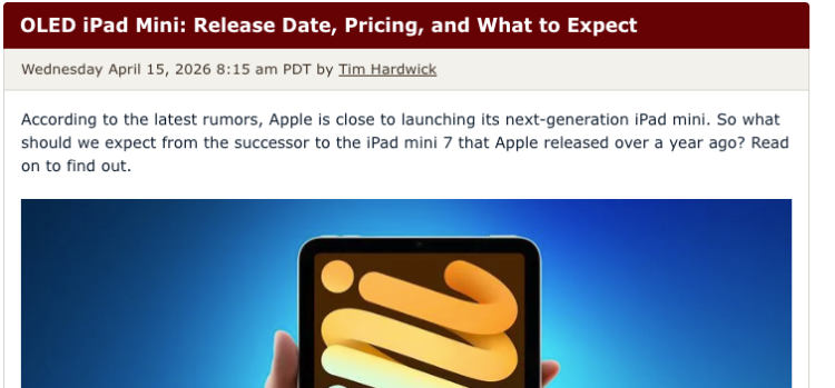 目前尚不清楚 iPad mini 8 的刷新率是否会高于现有 iPad mini 7 的 60Hz LCD 显示屏。不过,鉴于新款 iPhone 17 入门版已采用 120Hz ProMotion 面板,我们有理由期待首款 OLED iPad mini 也配备同样的刷新率。另有报道称,采用 OLED 显示屏后,iPad mini 8 的屏幕尺寸可能会从 8.3 英寸增加到 8.7 英寸。目前苹果所有旗舰级 iPhone 均采用 OLED 面板,并于 2024 年 5 月首次将这项显示技术应用于 iPad Pro。