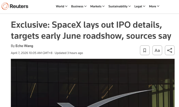 此外,据路透社此前报道,此次会议是SpaceX首次向所有承销商发出邀请,是该公司寻求筹集750亿美元资金流程中的重要一环。若此次IPO成功,预计将成为有史以来规模最大的首次公开募股,SpaceX的估值也将高达1.75万亿美元。(青山)