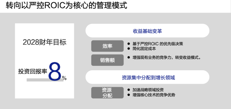 因此,此次最新发布的《2035长期企业愿景》不再只关注销售额,而是强调了ROIC(投资资本回报率)的重要性。《2035长期企业愿景》显示,到2028财年,ROIC目标设定为8%。同时,净资产收益率达到10%,销售利润率达到8%,工业领域利润占比要从现在的45%拉升到60%。