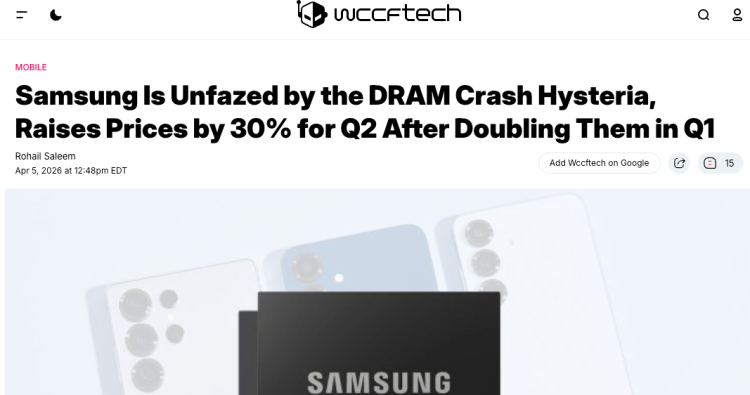 【环球网科技综合报道】4月7日消息,据Wccftech报道,存储芯片市场风云再起。继2026年第一季度内存产品价格同比平均上涨100%之后,三星再度宣布重大价格调整举措,其2026年第二季度内存产品价格平均上涨30%。