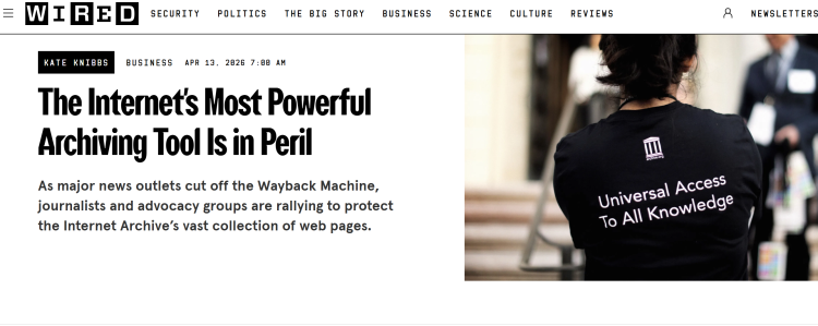 【环球网科技综合报道】4月14日消息,据 Wired 报道,美国多家主流新闻机构及社交平台近日相继对互联网档案馆旗下“时光机”网页存档工具实施封禁或访问限制,引发舆论对数字新闻历史记录保护、新闻监督及人工智能版权争议的广泛关注。