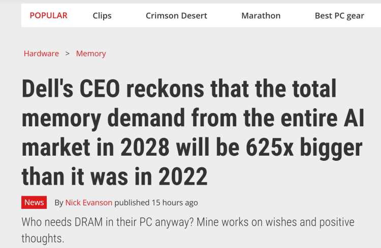 据迈克尔・戴尔介绍,625 倍的需求增长由两大核心因素驱动:2023 年英伟达推出的 H100 Tensor Core GPU 搭载 80GB HBM 内存,预计 2028 年单加速器内存容量将提升至 2TB,实现 25 倍增长;与此同时,全球 AI 加速器整体市场需求也将较 2023 年增长 25 倍,双重增长合力推动内存需求大幅跃升。