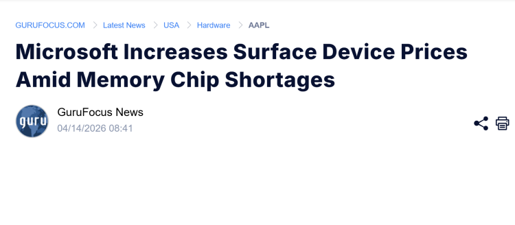 【环球网科技综合报道】4月14日消息,据GuruFocus报道,受全球内存(RAM)近期供应短缺影响,微软公司对旗下全系列 Surface 电脑产品实施价格调整,多款主力机型售价显著上涨,消费电子市场产业链波动传导效应持续显现。