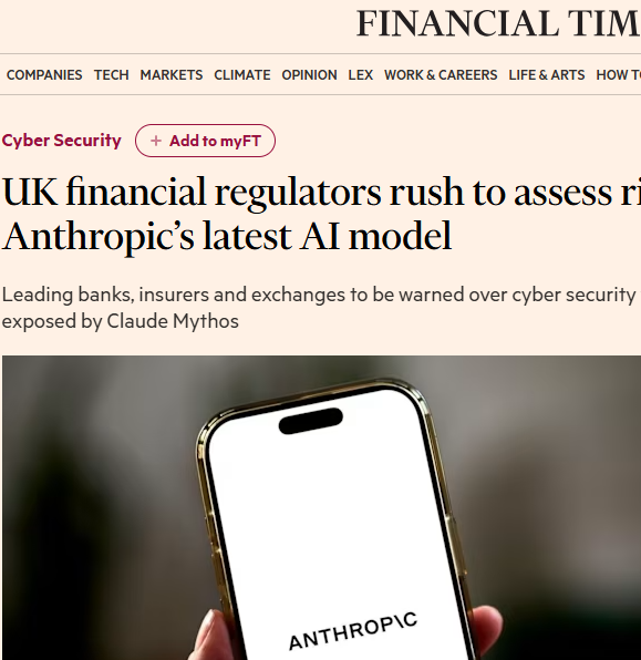 【环球网科技综合报道】据金融时报4月13日报道,英国金融监管机构正与政府网络安全监管机构、该国大型银行日前展开紧急磋商,重点评估Anthropic最新AI模型Claude Mythos Preview带来的安全风险,预计两周内将向主流银行、保险公司和交易所警示其暴露的网络安全漏洞。