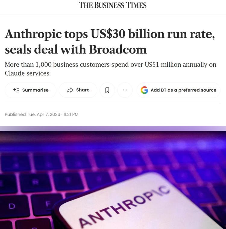 【环球网科技综合报道】4月8日消息,据businesstimes报道称,人工智能初创公司Anthropic近日宣布,其营收年化率已突破300亿美元大关,并确认与博通(Broadcom)及谷歌(Google)达成深度合作,旨在通过构建强大的算力基础设施,以支撑其业务的爆发式增长。