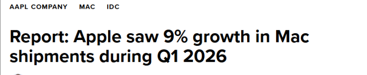 根据该报告,苹果公司在 2026 年第一季度出货了 620 万台 Mac,同比增长 9.1%,市场份额达到 9.5%,高于一年前的 8.9%。