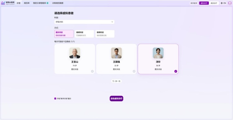 作为虚拟医疗体系的基础模块,系统现已覆盖26个临床科室,并生成了大规模超拟人的AI患者智能体。医生用户选择专科后,系统将随机推送匹配的虚拟患者。在此场景下,用户需完成问诊、开具检查单、诊断及出具处置意见的全流程模拟诊疗。平台能够高精度还原现实流程,自动生成并返回检查检验单与医学影像报告。诊疗结束后,系统会展示多位医生对同一虚拟患者的决策分布,且操作失误不会对虚拟系统或用户真实职业声誉造成负面影响,为低年资医生与医学生提供了低风险的演练环境。
